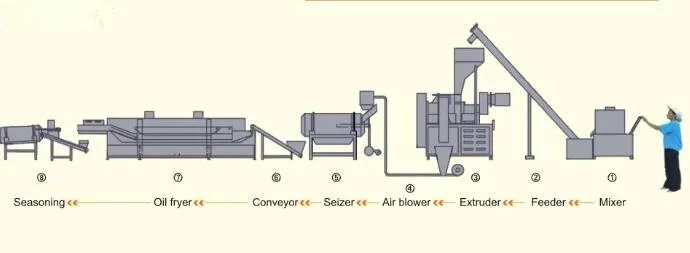 Flow chart:Mixing system---Extrusion system----Baking system (Frying System) ---Flavoring system---Packing system